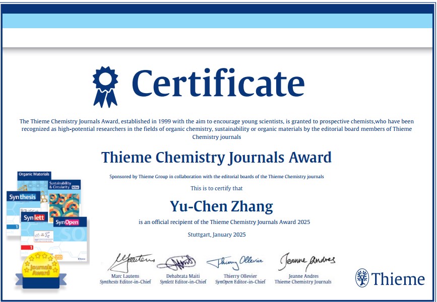 近日,Thieme學(xué)術(shù)出版集團(tuán)公布了2025年度“Thieme Chemistry Journals Award”學(xué)術(shù)獎(jiǎng)的獲獎(jiǎng)名單,我校化學(xué)與材料科學(xué)學(xué)院張宇辰教授成功入選,成為該學(xué)術(shù)獎(jiǎng)2025年度的獲得者之一。