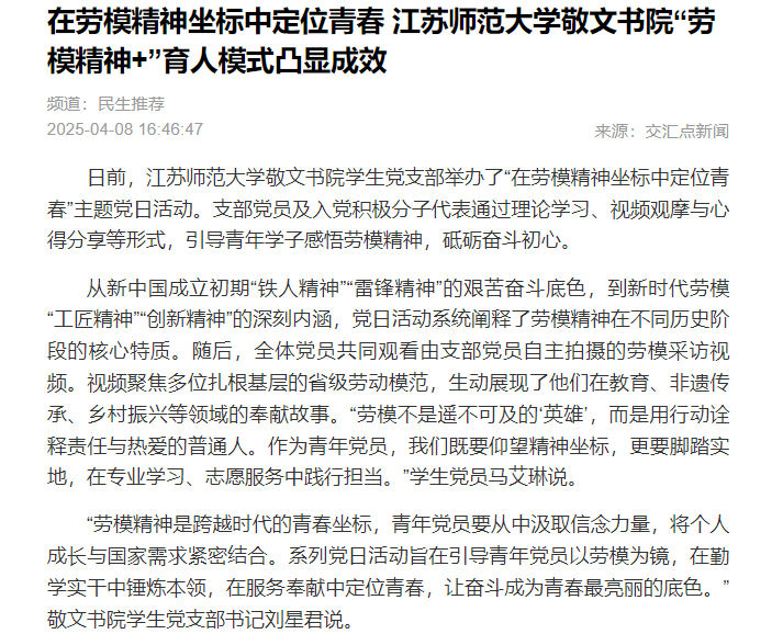 “系列活動不僅拓寬了我們學(xué)生黨建工作的深度與廣度,也有效開拓了我們思想政治育人的全新模式。通過營造更多讓青年大學(xué)生與榜樣面對面的機(jī)會,旨在激勵青年學(xué)子向勞模看齊,在實(shí)干中感悟勞動的精神價值,在新時代踐行使命擔(dān)當(dāng)和貢獻(xiàn)青春作為。”江蘇師范大學(xué)敬文書院黨委書記姜南表示。
