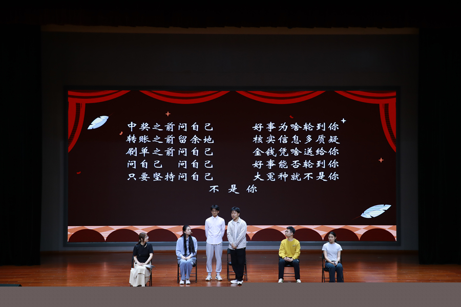 儀式上,徐州市公安局反通訊網絡詐騙中心劉旭警官現場講述真實騙局;中國工商銀行徐州泉山支行客服經理喬夢欣在線教學使用數字貨幣的安全使用技巧;徐州廣電反詐明星組合蘇蘇和小龍通過幽默生動的現場脫口秀和反詐小短劇教大家如何識破電信網絡詐騙伎倆;《張慧幫你問》主持人張丹茜以視頻形式曝光“快遞陷阱”;我校雷雨劇社的“反詐情景劇”揭示了校園內大學生容易遇到的各種電信網絡詐騙形式,為同學們發出警醒。