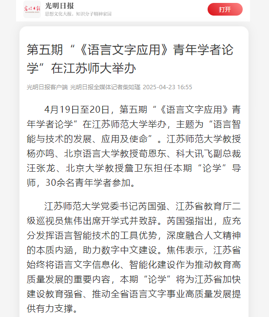 光明日報客戶端4月23日報道在我校舉辦的《語言文字應(yīng)用》青年學(xué)者論學(xué),報道內(nèi)容如下: