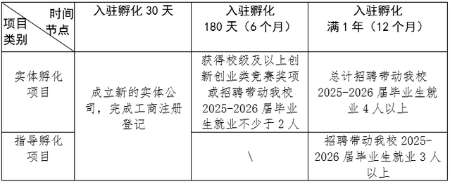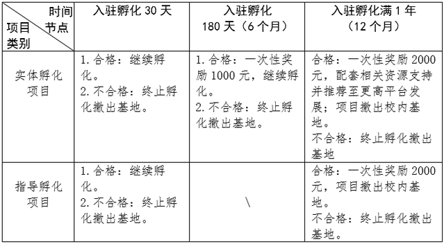 為加強孵化項目指導,突出創業帶動就業導向,學校將組織相關專家對孵化項目進行階段性的“把脈”考核,共設置三個節點,具體如下: