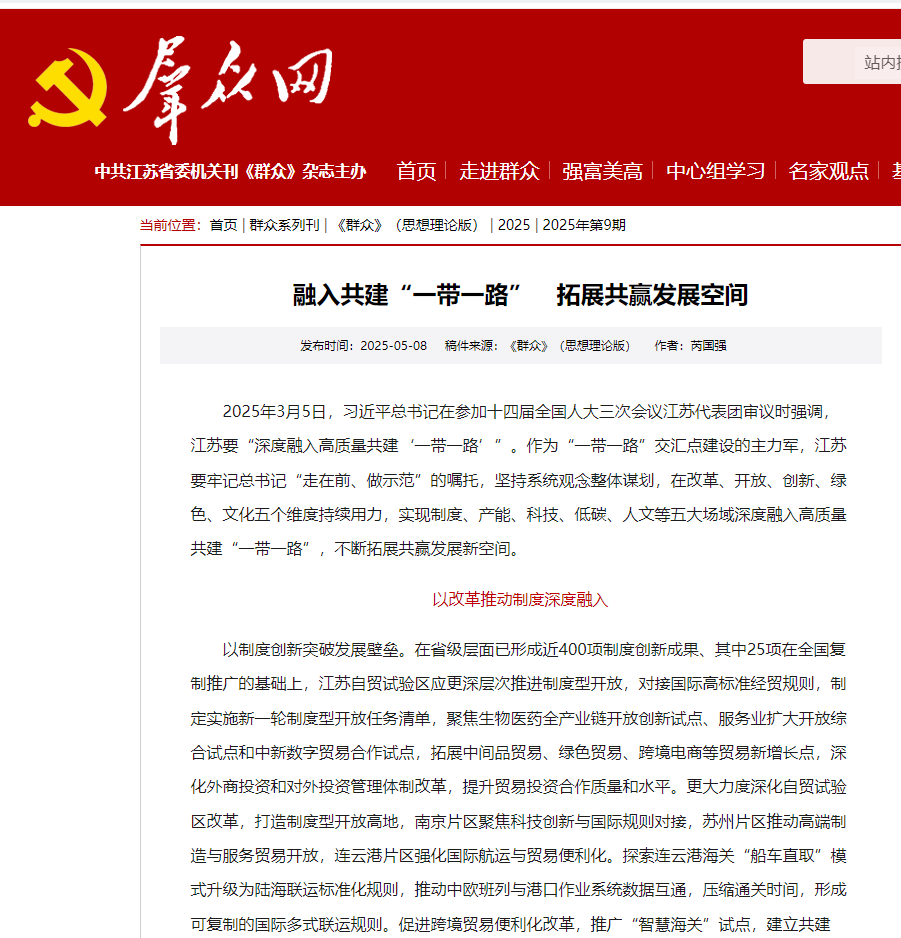 2025年3月5日,習(xí)近平總書記在參加十四屆全國人大三次會(huì)議江蘇代表團(tuán)審議時(shí)強(qiáng)調(diào),江蘇要“深度融入高質(zhì)量共建‘一帶一路’”。作為“一帶一路”交匯點(diǎn)建設(shè)的主力軍,江蘇要牢記總書記“走在前、做示范”的囑托,堅(jiān)持系統(tǒng)觀念整體謀劃,在改革、開放、創(chuàng)新、綠色、文化五個(gè)維度持續(xù)用力,實(shí)現(xiàn)制度、產(chǎn)能、科技、低碳、人文等五大場域深度融入高質(zhì)量共建“一帶一路”,不斷拓展共贏發(fā)展新空間。