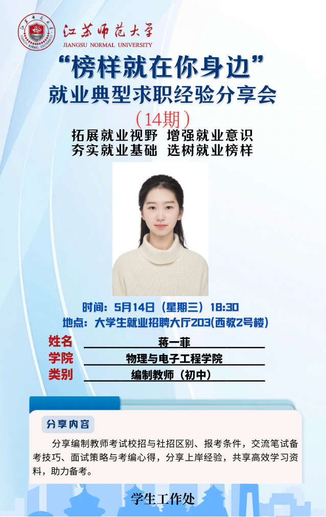 為增強學生就業意識,拓寬學生就業視野,夯實學生就業基礎,學生工作處結合學生關注度高、求職意愿強烈的行業領域,開展“榜樣就在你身邊”2025屆畢業生就業典型求職經驗分享系列活動,充分發揮朋輩榜樣的示范引領作用,幫助更多的學生提升就業競爭力。經學院推薦、學校遴選,現將第十四期活動開展相關情況通知如下: