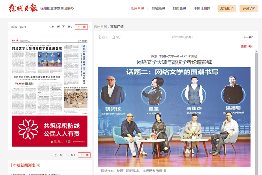 徐州日報5月14日報道在我校舉辦的“AI時代的網絡文學創作”系列活動,報道內容如下: