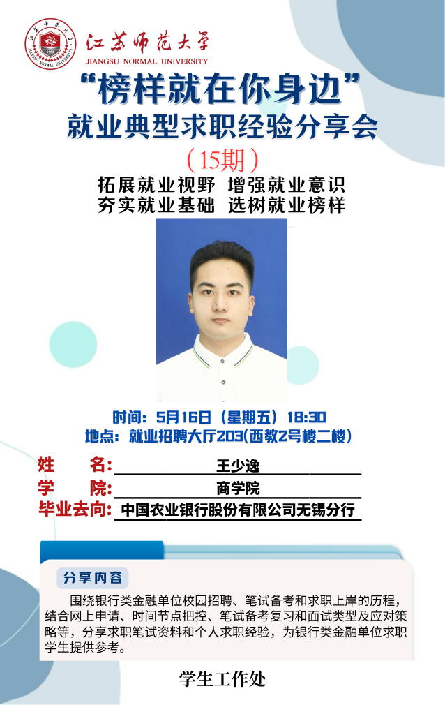 為增強學(xué)生就業(yè)意識,拓寬就業(yè)視野,夯實就業(yè)基礎(chǔ),學(xué)生工作處結(jié)合學(xué)生關(guān)注度高、求職意愿強烈的行業(yè)領(lǐng)域,開展“榜樣就在你身邊”2025屆畢業(yè)生就業(yè)典型求職經(jīng)驗分享系列活動,充分發(fā)揮朋輩榜樣的示范引領(lǐng)作用,幫助更多的學(xué)生提升就業(yè)競爭力。經(jīng)學(xué)院推薦、學(xué)校遴選,現(xiàn)將第十五期活動開展相關(guān)情況通知如下: