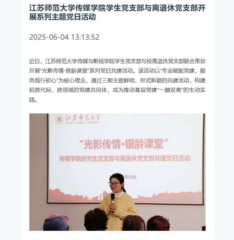 近日,江蘇師范大學傳媒與影視學院學生黨支部與校離退休黨支部聯(lián)合策劃開展“光影傳情·銀齡課堂”系列黨日共建活動。該活動以“專業(yè)賦能黨建,服務踐行初心”為核心理念,通過三期主題鮮明、形式新穎的共建活動,構(gòu)建起跨代際、跨領域的黨建共同體,成為推動基層黨建“一融雙高”的生動實踐。