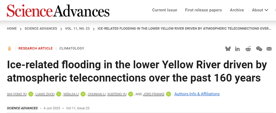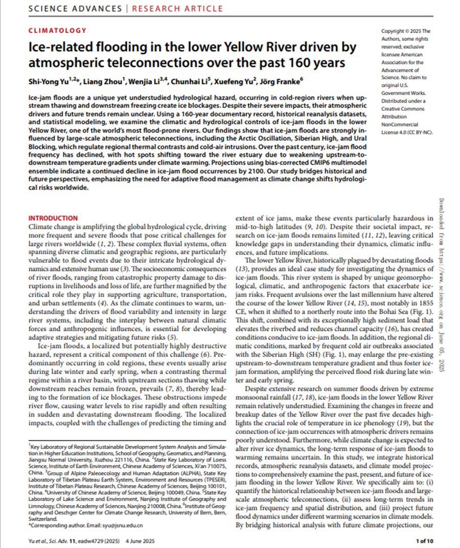 近日,我校地理測繪與城鄉規劃學院環境演變研究團隊以唯一通訊作者單位和第一作者單位在國際頂級期刊《Science Advances》上發表了一項突破性研究成果,系統揭示了黃河下游凌汛洪水在過去160年中的時空演變規律及其對全球變暖的響應機制。這一研究不僅為寒區河流洪水管理提供了全新的理論框架,還為相關政策制定和防災減災工作提供了重要科學依據。
