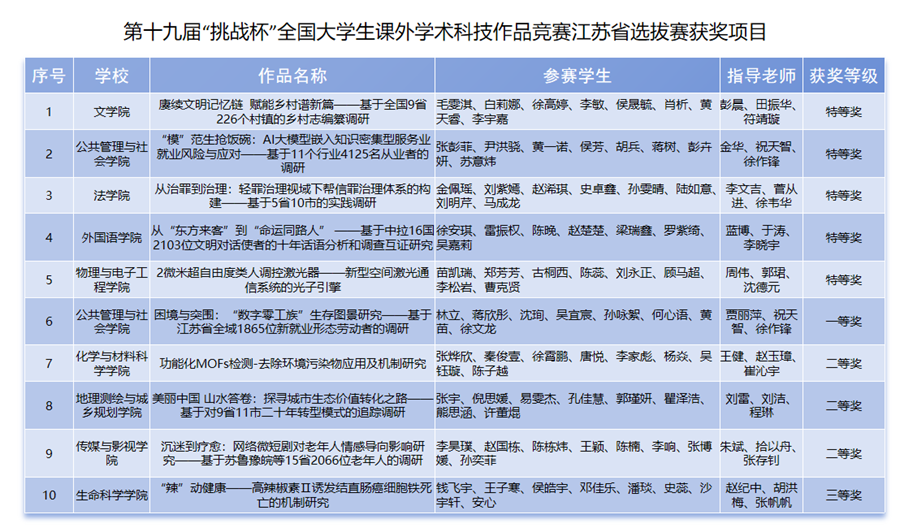 本屆比賽中,文學(xué)院《賡續(xù)文明記憶鏈賦能鄉(xiāng)村譜新篇——基于全國(guó)9省226個(gè)村鎮(zhèn)的鄉(xiāng)村志編纂調(diào)研》、公共管理與社會(huì)學(xué)院《“模”范生搶飯碗:AI大模型嵌入知識(shí)密集型服務(wù)業(yè)就業(yè)風(fēng)險(xiǎn)與應(yīng)對(duì)——基于11個(gè)行業(yè)4125名從業(yè)者的調(diào)研》、法學(xué)院《從治罪到治理:輕罪治理視域下幫信罪治理體系的構(gòu)建——基于5省10市的實(shí)踐調(diào)研》、外國(guó)語(yǔ)學(xué)院《從“東方來(lái)客”到“命運(yùn)同路人”——基于中拉16國(guó)2103位文明對(duì)話使者的十年話語(yǔ)分析和調(diào)查互證研究》、物理與電子工程學(xué)院《2微米超自由度類(lèi)人調(diào)控激光器——新型空間激光通信系統(tǒng)的光子引擎》五個(gè)項(xiàng)目榮獲特等獎(jiǎng),公共管理與社會(huì)學(xué)院《困境與突圍:“數(shù)字零工族”生存圖景研究——基于江蘇省全域1865位新就業(yè)形態(tài)勞動(dòng)者的調(diào)研》榮獲一等獎(jiǎng),化學(xué)與材料科學(xué)學(xué)院《功能化MOFs檢測(cè)-去除環(huán)境污染物應(yīng)用及機(jī)制研究》、地理測(cè)繪與城鄉(xiāng)規(guī)劃學(xué)院《美麗中國(guó)山水答卷:探尋城市生態(tài)價(jià)值轉(zhuǎn)化之路——基于對(duì)9省11市二十年轉(zhuǎn)型模式的追蹤調(diào)研》、傳媒與影視學(xué)院《沉迷到療愈:網(wǎng)絡(luò)微短劇對(duì)老年人情感導(dǎo)向影響研究——基于蘇魯豫皖等15省2066位老年人的調(diào)研》三個(gè)項(xiàng)目榮獲二等獎(jiǎng),生命科學(xué)學(xué)院《“辣”動(dòng)健康——高辣椒素Ⅱ誘發(fā)結(jié)直腸癌細(xì)胞鐵死亡的機(jī)制研究》榮獲三等獎(jiǎng)。