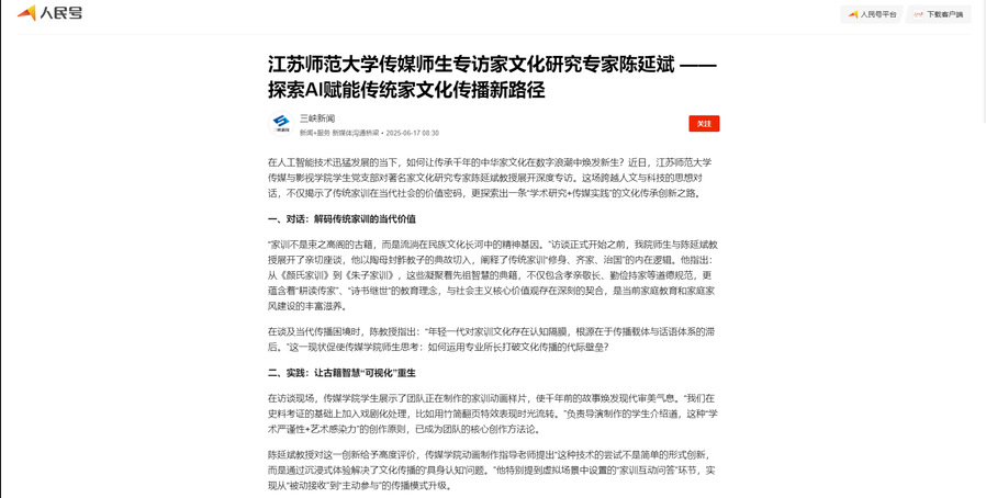 在訪談現場,傳媒學院學生展示了團隊正在制作的家訓動畫樣片,使千年前的故事煥發現代審美氣息。“我們在史料考證的基礎上加入戲劇化處理,比如用竹簡翻頁特效表現時光流轉。”負責導演制作的學生介紹道,這種“學術嚴謹性+藝術感染力”的創作原則,已成為團隊的核心創作方法論。