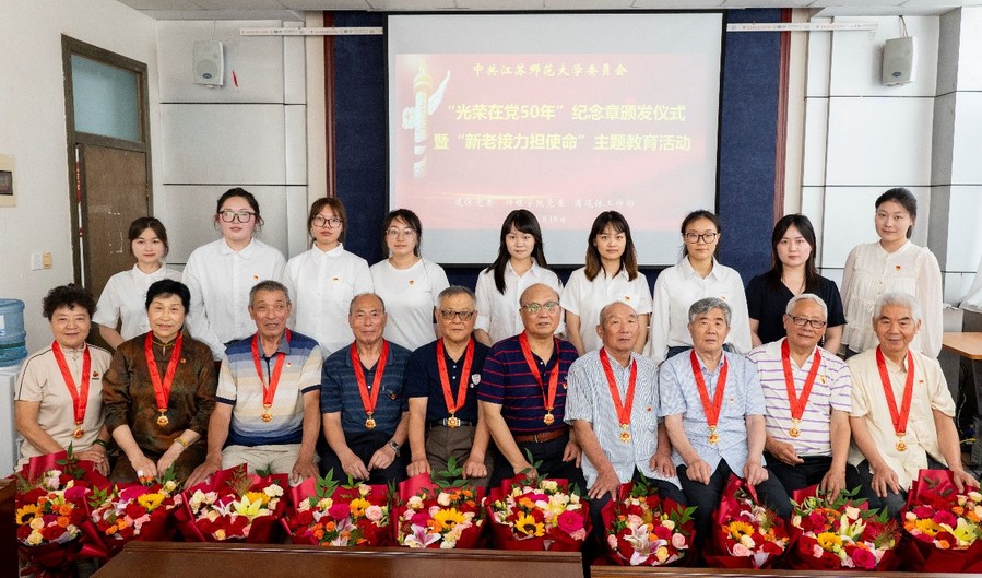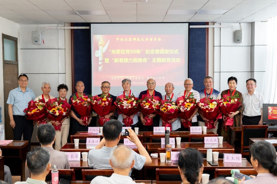 6月18日上午,“光榮在黨50年”紀(jì)念章頒發(fā)儀式暨“新老接力擔(dān)使命”主題教育活動在我校云龍校區(qū)舉行。校黨委書記芮國強(qiáng),校黨委常委、副校長、組織部部長、統(tǒng)戰(zhàn)部部長黃德志,校相關(guān)部門和學(xué)院負(fù)責(zé)人出席活動,獲得“光榮在黨50年”榮譽(yù)的老同志及離退休工作部、傳媒與影視學(xué)院黨委師生黨員代表齊聚一堂,共同見證這一光榮時刻。