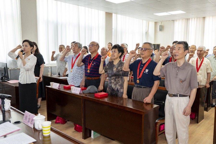 芮國強(qiáng)為10位黨齡滿50年的老黨員一一頒發(fā)紀(jì)念章,代表學(xué)校黨委對獲得紀(jì)念章的老黨員們表達(dá)了最崇高的敬意和祝賀。他指出,老黨員們是學(xué)校發(fā)展的功臣與師生學(xué)習(xí)的楷模,他們用一生詮釋了對黨的忠誠與奉獻(xiàn)。同時,芮國強(qiáng)也對全體黨員提出四點(diǎn)期望:一是堅定理想信念,以老黨員為榜樣,用習(xí)近平新時代中國特色社會主義思想武裝頭腦,踐行聽黨話、跟黨走的追求;二是珍視黨員身份,以老黨員為燈塔,在各自崗位上發(fā)光發(fā)熱,書寫無悔青春;三是強(qiáng)化責(zé)任擔(dān)當(dāng),聚焦學(xué)校“改革、拓展、轉(zhuǎn)型、提檔”中心任務(wù),積極作為,推動學(xué)校高質(zhì)量發(fā)展;四是傳承優(yōu)良作風(fēng),嚴(yán)守黨的紀(jì)律,自覺抵制誘惑,共同營造風(fēng)清氣正的校園環(huán)境。他強(qiáng)調(diào),全體黨員要以此次活動為契機(jī),傳承紅色基因,攜手共創(chuàng)高水平師范大學(xué)的美好未來。