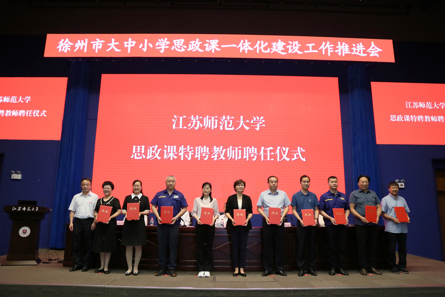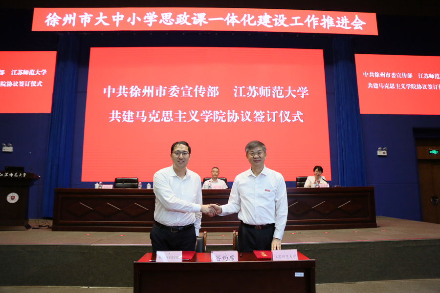 會上,徐州市委宣傳部、江蘇師范大學現(xiàn)場簽署馬克思主義學院共建協(xié)議,芮國強為賈萍、韓峰、李翠梅、原豐、孟維、張懷紅、周長芝、孟慶喜、胡軍英、王計兵頒發(fā)“江蘇師范大學思政課特聘教師”聘書。中國礦業(yè)大學馬克思主義學院院長閻國華,徐州市鯤鵬路初級中學思政課教師蘇維、徐州市太行路小學思政課教師張珮依次發(fā)言,圍繞如何提升思政課質量總結經(jīng)驗、建言獻策。會議還發(fā)布了徐州市“博物館里的思政課”系列課程,邀請了揚州市教育科學研究院副院長王恒富作專家主旨報告。