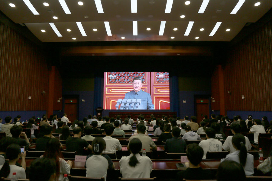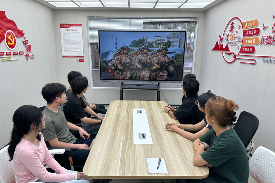 天安門廣場上,鐵流滾滾,戰(zhàn)旗獵獵,全國各地、各族群眾以各種方式收聽收看大會盛況,江蘇師范大學(xué)組織師生在分析測試中心100進(jìn)行了集中收看。校領(lǐng)導(dǎo)、校有關(guān)部門和學(xué)院負(fù)責(zé)人、師生代表、思政課教師和輔導(dǎo)員代表,民主黨派人士和退役軍人代表、國際留學(xué)生代表近200人參加集中收看。我校退役大學(xué)生代表“先勝中隊”也組織部分成員在一站式社區(qū)進(jìn)行了集中收看。