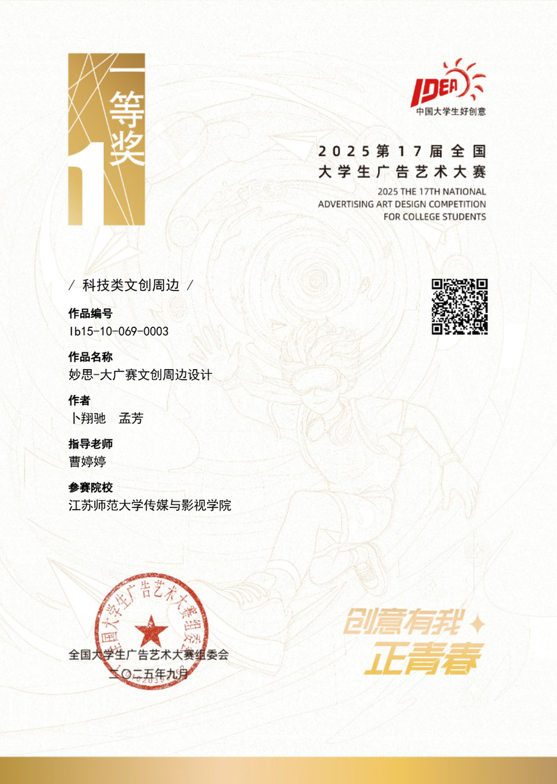 近日,第17屆全國(guó)大學(xué)生廣告藝術(shù)大賽全國(guó)總評(píng)審結(jié)果揭曉,我校傳媒與影視學(xué)院學(xué)子收獲了一等獎(jiǎng)1項(xiàng)、三等獎(jiǎng)2項(xiàng)、優(yōu)秀獎(jiǎng)7項(xiàng)共10個(gè)獎(jiǎng)項(xiàng),獲獎(jiǎng)作品涵蓋科技類文創(chuàng)周邊、平面廣告、廣播類、IP與創(chuàng)意周邊、視頻類、策劃案類等多個(gè)類別。
