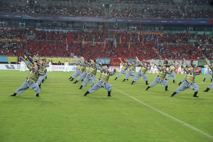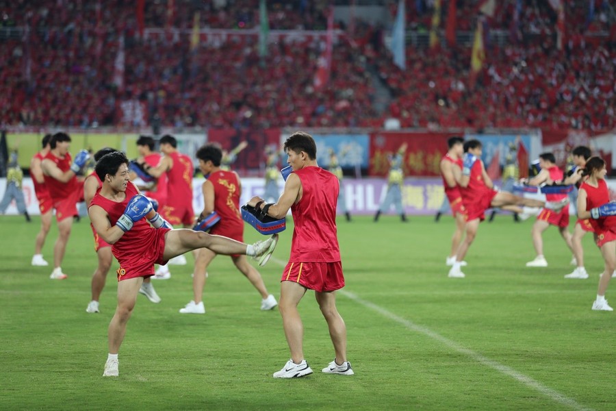 9月20日晚,“蘇超”聯賽第12輪徐州隊與蘇州隊的比賽在徐州奧體中心拉開帷幕。開賽前夕,169名江蘇師范大學學子以一場氣勢恢宏的《大漢雄風》表演,將現場氛圍推向首個高潮。這場長達7分鐘的表演,將中華武術與兵馬俑舞元素深度融合,以?“武魂起,俑魄生”為核心理念,通過剛猛凌厲的武技與雄渾厚重的舞姿,生動再現了古代戰場的豪情。刀光隨鼓點流轉,陣型隨韻律變幻,動靜之間,令現場數萬名觀眾沉浸于跨越時空的文化震撼,更彰顯出徐州作為兩漢文化發源地的深厚底蘊。