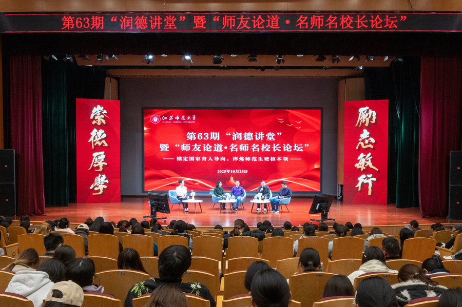 10月25日下午,黨委學生工作部、國內合作處(校友聯誼會辦公室)在馬可音樂廳共同舉辦第63期“潤德講堂”暨“師友論道?名師名校長論壇”活動。校友張飛、高青、王宗信和陳衛東圍繞“錨定國家育人導向,淬煉師范生硬核本領”主題,分享實踐經驗、共話育人之道。