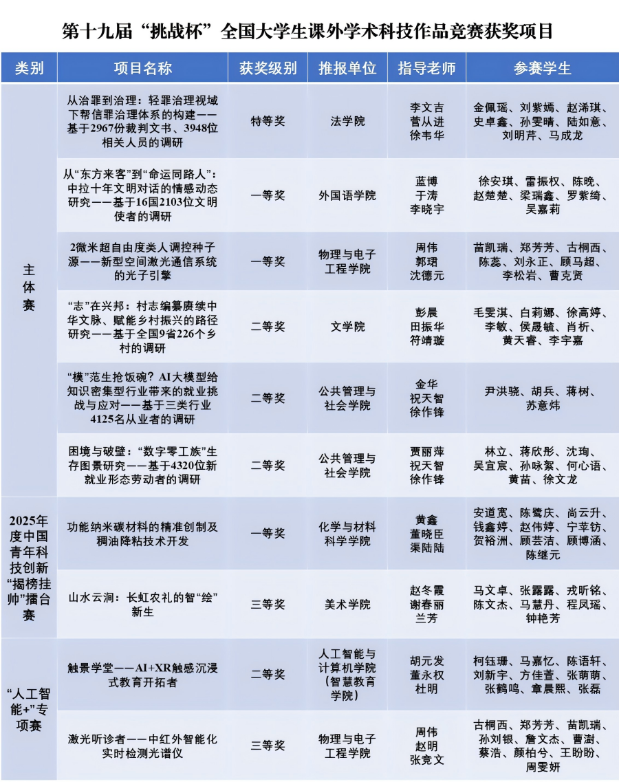 在主體賽中,我校6個項目全部通過網評,入圍終審決賽。法學院《從治罪到治理:輕罪治理視域下幫信罪治理體系的構建——基于2967份裁判文書、3948位相關人員的調研》榮獲特等獎,外國語學院《從“東方來客”到“命運同路人”:中拉十年文明對話的情感動態研究——基于16國2103位文明使者的調研》、物理與電子工程學院《2微米超自由度類人調控種子源——新型空間激光通信系統的光子引擎》榮獲一等獎,文學院《“志”在興邦:村志編纂賡續中華文脈、賦能鄉村振興的路徑研究——基于全國9省226個鄉村的調研》、公共管理與社會學院《“模”范生搶飯碗?AI大模型給知識密集型行業帶來的就業挑戰與應對——基于三類行業4125名從業者的調研》、公共管理與社會學院《困境與破壁:“數字零工族”生存圖景研究——基于4320位新就業形態勞動者的調研》榮獲二等獎; 2025年度中國青年科技創新“揭榜掛帥”擂臺賽中,化學與材料科學學院《功能納米碳材料的精準創制及稠油降粘技術開發》榮獲一等獎,美術學院《山水云澗:長虹農禮的智“繪”新生》榮獲三等獎;“人工智能+”專項賽中,人工智能與計算機學院(智慧教育學院)《觸景學堂——AI+XR觸感沉浸式教育開拓者》榮獲二等獎,物理與電子工程學院《激光聽診者——中紅外智能化實時檢測光譜儀》榮獲三等獎。