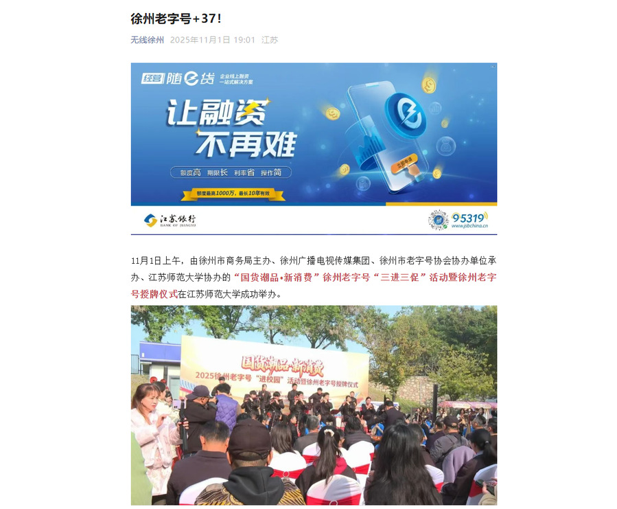 徐州廣電“無線徐州”11月1日報道徐州老字號“三進三促”活動暨徐州老字號授牌儀式在江蘇師范大學成功舉辦,報道內容如下: