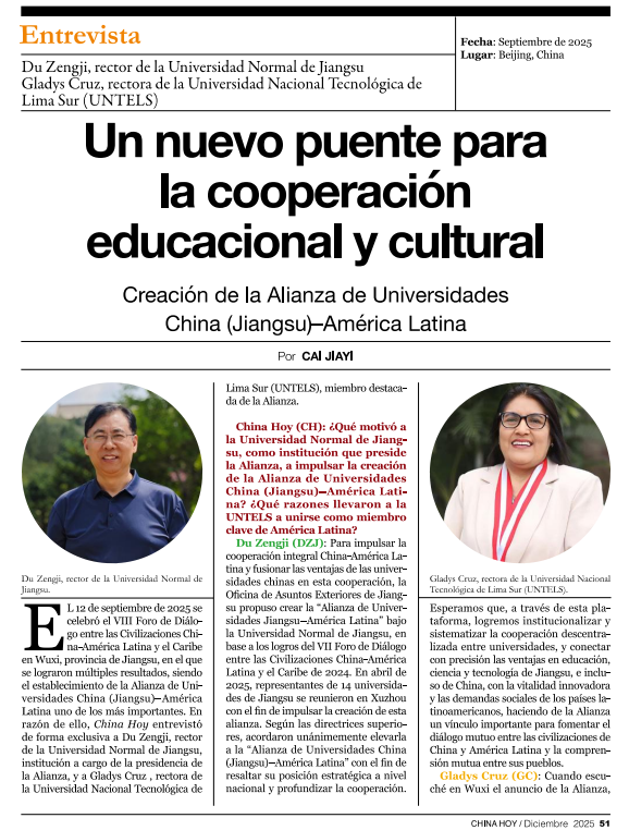 此次報道源于今年9月在江蘇無錫舉辦的第八屆中拉文明對話論壇,該論壇由江蘇省人民政府外事辦公室、中國社會科學院拉丁美洲研究所、中國外文局當代中國與世界研究院聯合主辦。作為本屆論壇的兩項重要成果之一,由我校作為會長單位聯合22所國內高校和33所拉美高校、科研機構共同發起的“中國(江蘇)—拉美高校聯盟”正式成立。中國外文局依托《今日中國》雜志的國際傳播影響力,以“中國—拉美高校校長對話”形式,邀請我校校長杜增吉教授和拉方創始成員單位——秘魯南利馬國立科技大學校長格拉迪斯·克魯斯教授共話中拉合作新路徑。