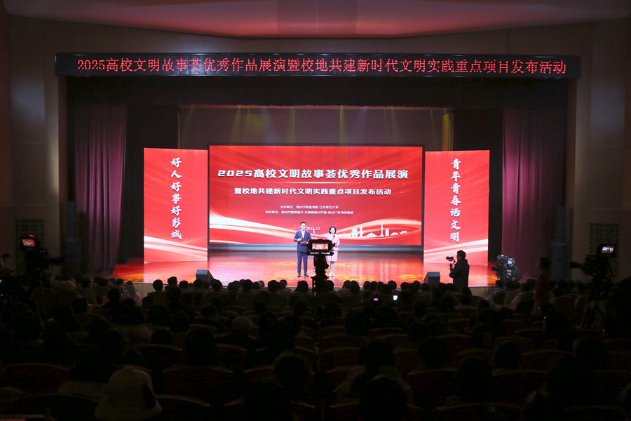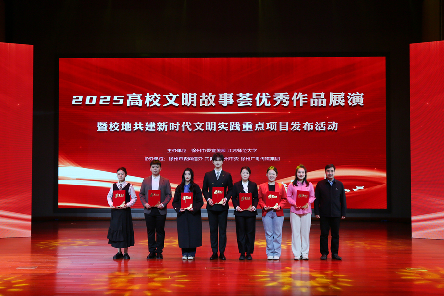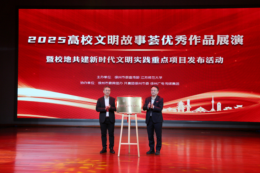 12月17日下午,2025高校文明故事薈優秀作品展演暨校地共建新時代文明實踐重點項目發布活動在我校舉辦。本次活動主題為“好人好事好彭城·青年青春話文明”,由徐州市委宣傳部、江蘇師范大學主辦,徐州市委網信辦、共青團徐州市委、徐州報業傳媒集團、徐州廣電傳媒集團、銅山區新時代文明實踐中心、泉山區新時代文明實踐中心協辦。徐州市委常委、宣傳部部長劉偉,我校黨委書記芮國強、黨委副書記蔡國春出席活動,市委宣傳部、市委網信辦、團市委、徐州廣電傳媒集團等單位部門相關負責同志,駐徐高校黨委宣傳部(黨群工作部、黨委工作部)、團委主要負責同志以及江蘇師范大學師生參加活動。