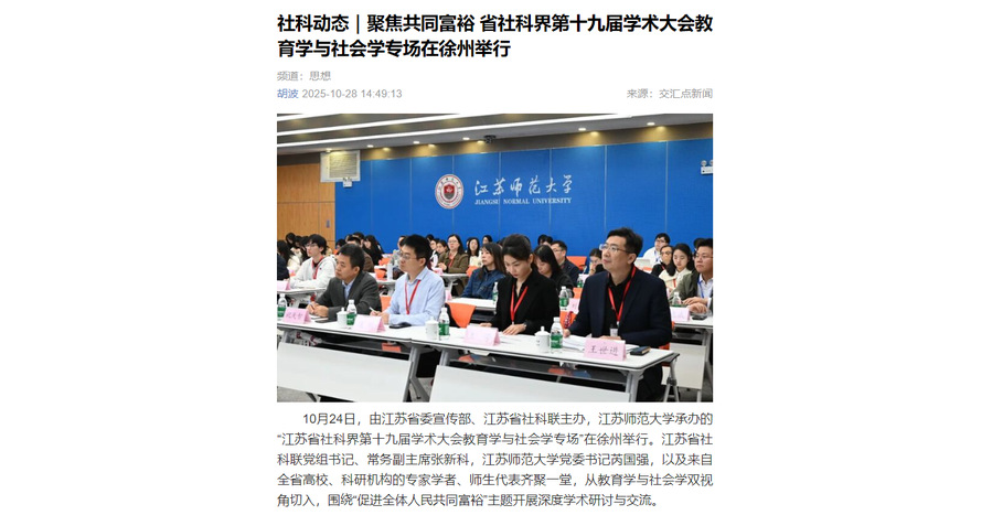 10月24日,由江蘇省委宣傳部、江蘇省社科聯主辦,江蘇師范大學承辦的“江蘇省社科界第十九屆學術大會教育學與社會學專場”在徐州舉行。江蘇省社科聯黨組書記、常務副主席張新科,江蘇師范大學黨委書記芮國強,以及來自全省高校、科研機構的專家學者、師生代表齊聚一堂,從教育學與社會學雙視角切入,圍繞“促進全體人民共同富裕”主題開展深度學術研討與交流。