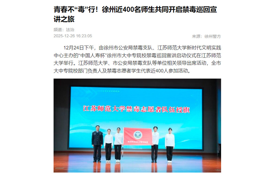 交匯點新聞12月26日發布我校與徐州市公安局禁毒支隊主辦的禁毒巡回宣講活動,內容如下: