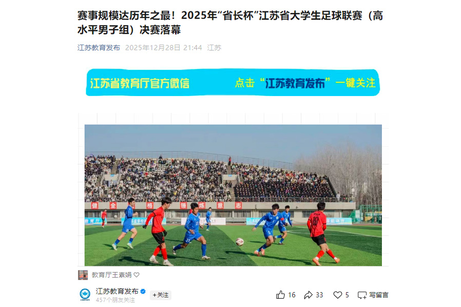 江蘇省教育廳“江蘇教育發(fā)布”微信公眾號12月28日關(guān)注我校在2025年“省長杯”江蘇省大學(xué)生足球聯(lián)賽(高水平男子組)決賽中奪冠,內(nèi)容如下: