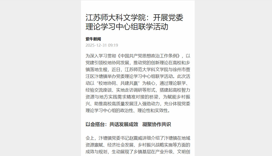 為深入學習貫徹《中國共產黨思想政治工作條例》,以黨建引領校地協同發展,推動黨的創新理論在高校和鄉鎮落地生根,近日,江蘇師范大學科文學院與徐州市賈汪區汴塘鎮舉辦黨委理論學習中心組聯學活動。此次活動以“校地協同、共建共贏”為核心,通過理論聯學、經驗交流座談、實地走訪調研等形式,搭建起高校智力資源與地方實踐需求精準對接的橋梁,為賦能鄉村振興、助推高校高質量發展注入強勁動力,充分體現黨委理論學習中心組的政治性、理論性和實效性。