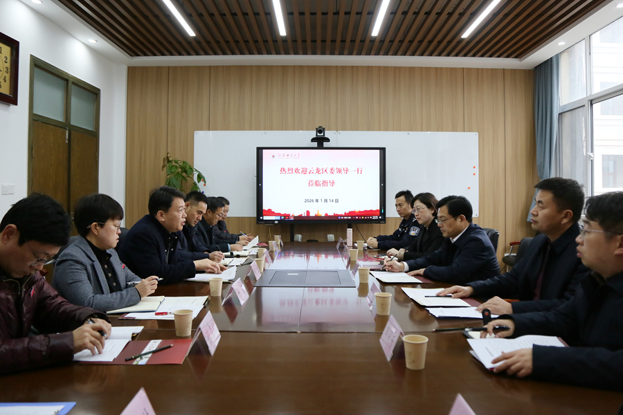 1月14日,云龍區委副書記李強率區委辦、區教育局、區科技局、彭城街道及彭城派出所等單位相關負責同志來到云龍校區,就高校安全穩定工作與校地融合發展進行專題調研并座談交流。校黨委常委、紀委書記、派駐監察專員閭浩主持會議并講話,學校相關職能部門負責人參加座談。