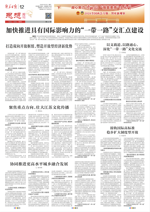 高質量共建“一帶一路”是推進高水平對外開放的戰略舉措。當前國際經貿格局深刻重構,全球產業鏈供應鏈加速調整。“十五五”時期,江蘇作為經濟大省、開放大省,如何以“一帶一路”交匯點建設為總攬,加快建設具有世界聚合力的雙向開放樞紐,在服務構建新發展格局中展現更大作為,是需要回答好的時代命題。