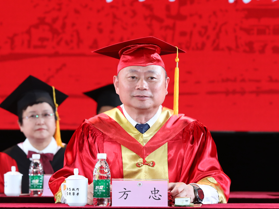伴隨著莊嚴(yán)的國歌聲,畢業(yè)典禮正式開幕。校長、校學(xué)位評(píng)定委員會(huì)主席周汝光在典禮上致辭,代表學(xué)校向圓滿完成學(xué)業(yè)的畢業(yè)生們表示熱烈祝賀,向辛勤培育、陪伴支持畢業(yè)生的老師和家長致以衷心感謝。周汝光以“擦亮青春底色,唱響時(shí)代之音”為題,飽含深情地回顧了全體畢業(yè)研究生在讀期間取得的成績,充分肯定了大家在疫情防控期間與學(xué)校息息相通,甘苦與共,用實(shí)際行動(dòng)關(guān)注支持學(xué)校事業(yè)發(fā)展作出的努力。他寄語全體畢業(yè)研究生,生逢偉大時(shí)代,不僅要學(xué)有所成,更要學(xué)有所思、學(xué)有所用,做持之以恒的自律者、堅(jiān)韌不拔的奮斗者、矢志不渝的愛國者。周汝光勉勵(lì)全體畢業(yè)研究生要傳承好“崇德厚學(xué),勵(lì)志敏行”的校訓(xùn),心中有陽光,腳下有力量,篤行致遠(yuǎn)、惟實(shí)勵(lì)新,不墜青云之志,創(chuàng)造無愧于時(shí)代的精彩人生。