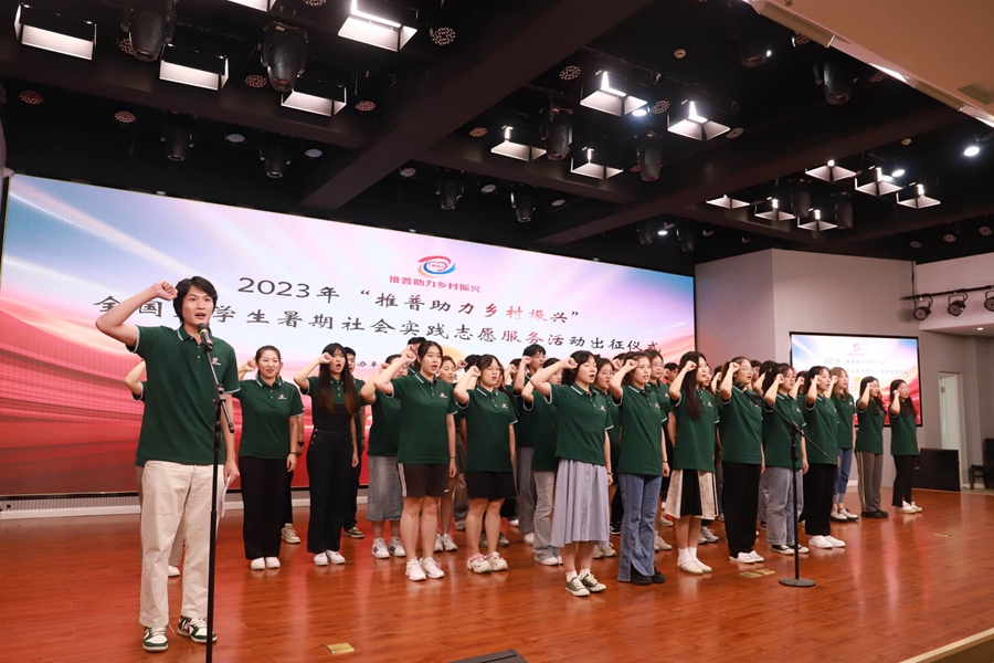 7月9日,由教育部語言文字應用管理司、共青團中央青年發(fā)展部共同主辦的2023年“推普助力鄉(xiāng)村振興”全國大學生暑期社會實踐志愿服務活動出征儀式在我校舉行。教育部語言文字應用管理司宣教處處長張艷,我校黨委書記方忠,副校長錢進和教育部長江學者特聘教授,江蘇師范大學國家語委語言能力高等研究院院長楊亦鳴出席出征儀式。來自北京大學、清華大學等573所高校1176支團隊的大學生志愿者通過線上線下的方式參加出征儀式。出征儀式上,張艷處長和楊亦鳴教授為實踐團代表授予物資,江蘇師范大學志愿者代表仲俊儒帶領實踐團學生代表進行莊嚴宣誓。出征儀式結(jié)束后,12405名大學生志愿者將在短暫培訓過后分赴祖國大地的邊疆地區(qū)、民族地區(qū)和農(nóng)村地區(qū)開展推普助力鄉(xiāng)村振興社會實踐活動。