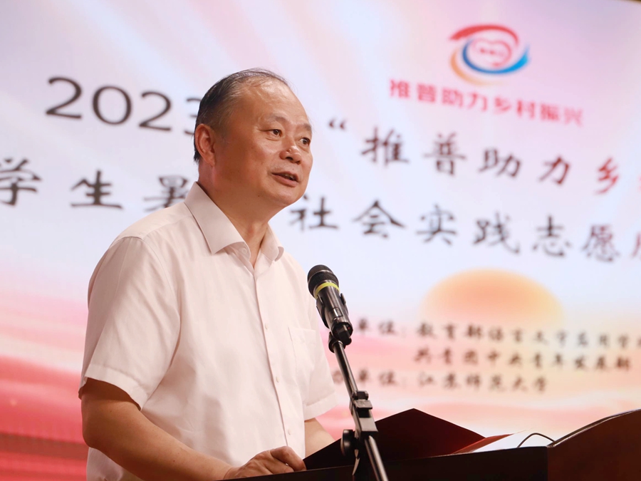 方忠代表學校在出征儀式上致辭,簡要介紹了我校在“推普助力鄉(xiāng)村振興”中承擔的有關工作和取得的成績。他希望“推普助力鄉(xiāng)村振興”實踐團隊的全體志愿者能夠勇?lián)鷷r代賦予的重任,不怕苦,不怕累,用自己的所學所長做好實踐服務,以實際行動為推進鄉(xiāng)村振興作出貢獻。