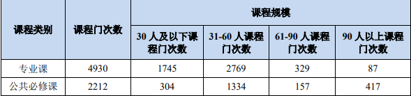 全校開設課程總門數 2021-2022 學年,學校開設本科專業課 2804 門、4917 門次;開設本科公共必修課 136 門、2515 門次。 實踐教學學分占總學分比例 各學科實踐教學課程學分占總學分平均比例分別為:農學:36.02%;歷史學:17.28%;哲學:23.13%;工學:30.85%;教育學:21.60%;文學:19.04%;法學:22.50%;理學:28.14%;管理學:22.48%;經濟學:21.41%;藝術學:40.16%。 選修學分占總學分比例 各學科選修課學 分占總學分比例分別為:經濟學:25.82%;法學:20.26%;教育學:29.48%;文學:23.00%;歷史學:16.67%;理學:20.36%;工學:16.54%;農學:19.88%;管理學:24.51%;藝術學:18.80%;哲學:25.00%。 課堂規模 2021-2022 學年堅持以中小型開課班為主的課堂教學模式,保證課堂教學質量,課程規模情況如表所示。 2021-2022學年課程規模情況