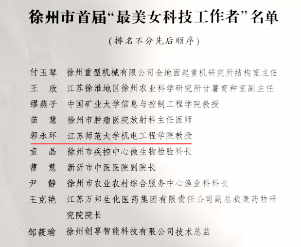 為表彰先進、樹立榜樣,深入貫徹落實全國婦聯、省婦聯“科技創新巾幗行動”工作部署,進一步引領和激勵全市廣大婦女堅定不移聽黨話、跟黨奮進新征程,近日,徐州市婦女聯合會等單位先后表彰了一批先進典型(徐婦發〔2023〕15號、徐婦發〔2023〕21號)。我校電氣工程及自動化學院段納教授獲2022年度“徐州市三八紅旗手”榮譽稱號,機電工程學院郭永環教授獲徐州市首屆“最美女科技工作者”榮譽稱號。