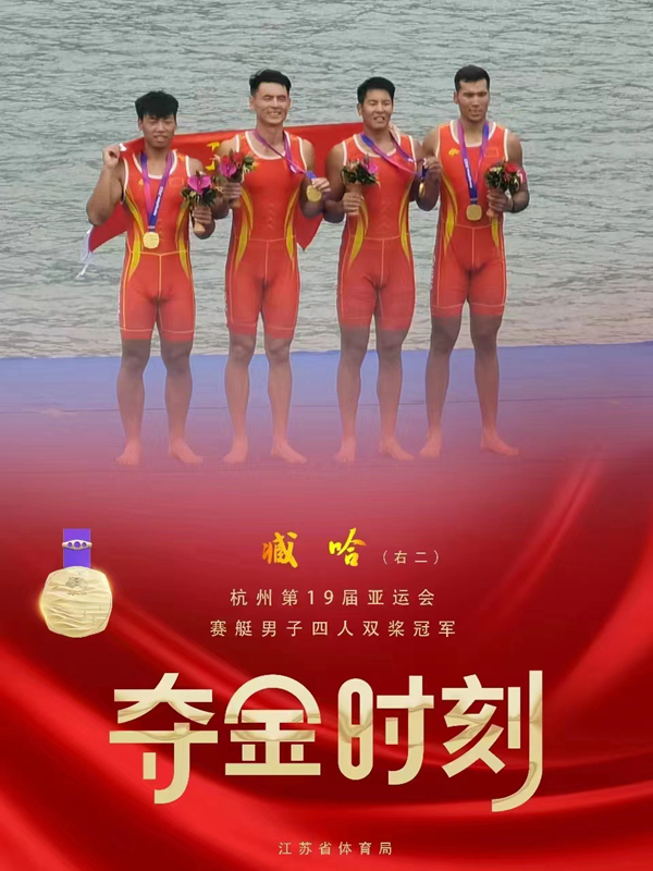在賽艇項目中,我校有兩名畢業(yè)生參加比賽,分別是2023屆畢業(yè)生蔡鵬鵬和臧哈。在賽艇男子八人單槳有舵手決賽中,蔡鵬鵬與隊友團(tuán)結(jié)協(xié)作,以5分40秒的成績奪得金牌,這是江蘇健兒參加杭州亞運會獲得的首枚金牌。同時,蔡鵬鵬在賽艇男子四人單槳決賽中奪得銀牌。在賽艇項目男子四人雙槳決賽中,臧哈搭檔隊友以6分02秒問鼎金牌。