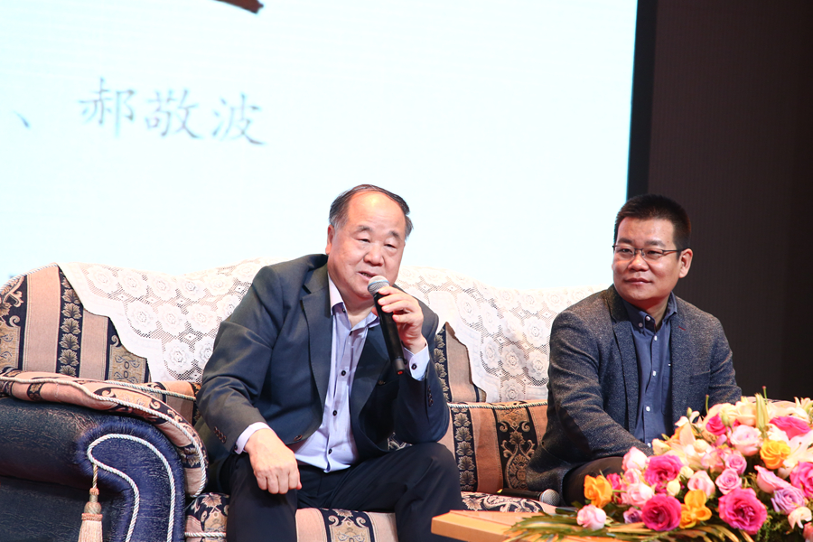 在報告會第二階段,作家莫言、徐則臣與學者蘇州大學文學院王堯教授、我校文學院郝敬波教授圍繞莫言的藝術創(chuàng)作話題展開圓桌對談。對談由王堯教授主持。對談會上,莫言闡述了由小說家向劇作家轉型的思想動力和創(chuàng)作情結,回顧了從湯顯祖到莎士比亞的中外戲劇傳統(tǒng),并就《鱷魚》創(chuàng)作的相關背景作了介紹。徐則臣就后諾獎時代莫言的創(chuàng)作風格的深刻變化作了細致剖析,并以自身文學創(chuàng)作的實踐體驗闡釋了文學傳統(tǒng)書寫的獨特藝術魅力。王堯教授系統(tǒng)梳理了學術界對莫言作品的研究歷程,對莫言作品的敘事特點、鄉(xiāng)土意識、傳統(tǒng)文化情懷作了深入點評。郝敬波教授重點談了莫言作品的藝術影響力和帶動效應,提出莫言藝術經(jīng)驗中的傳統(tǒng)敘事、民間資源的傳承與探索對徐則臣等一代作家產(chǎn)生了深刻的影響。報告會現(xiàn)場,莫言老師還就師生提出的相關學術問題進行了互動交流。