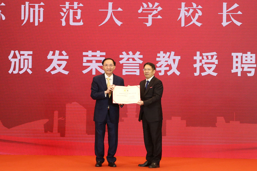 周汝光向林高演頒發(fā)江蘇師范大學(xué)榮譽教授聘書
