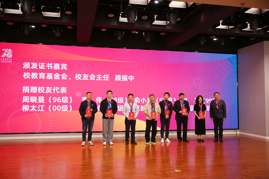 校教育基金會、校友會負(fù)責(zé)人向?yàn)榇舜螒c典活動捐款捐物的校友趙平、俞小惠、李偉、柳太江、范懿銘、周曉曼、張樹娟、王弢頒發(fā)了捐贈證書。