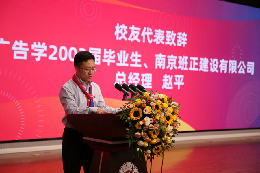 南京班正建設(shè)有限公司總經(jīng)理、99級廣告班班長趙平代表廣告學(xué)專業(yè)校友致辭。他對廣告學(xué)專業(yè)30周年慶典致以誠摯的祝賀,分享自己在師大求學(xué)成長的故事,追憶師生情誼。他指出,廣告人擁有敏銳的洞察力,無限的創(chuàng)造力以及適應(yīng)潮流、引領(lǐng)潮流的信心和能力,希望廣告學(xué)專業(yè)進(jìn)一步強(qiáng)化產(chǎn)學(xué)研融合,提高人才培養(yǎng)質(zhì)量。