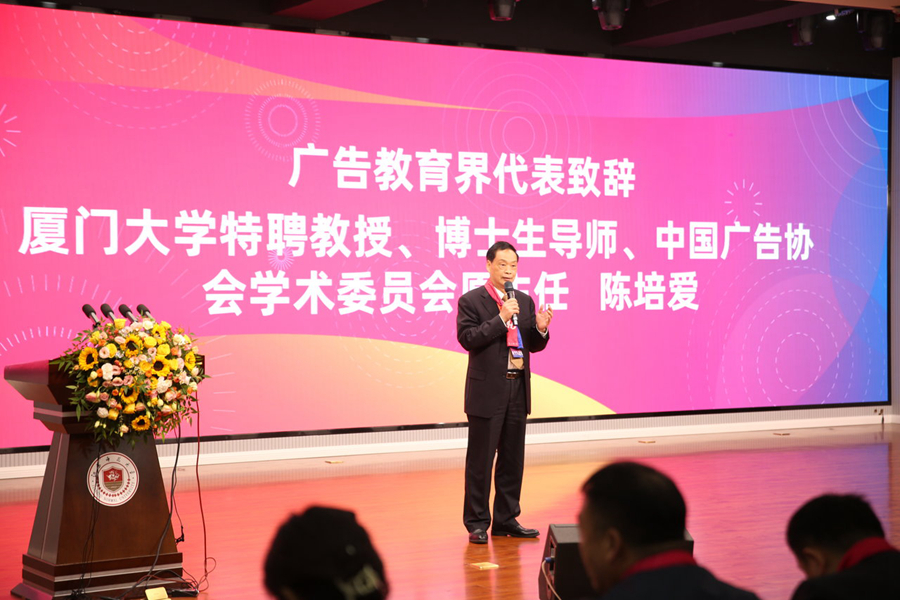 陳培愛代表廣告教育界致辭。他充分肯定了江蘇師范大學(xué)廣告學(xué)專業(yè)取得的豐碩成果,并結(jié)合個人學(xué)術(shù)研究和專業(yè)教學(xué)經(jīng)歷,闡述中國廣告學(xué)專業(yè)和廣告事業(yè)40年的發(fā)展歷程和未來發(fā)展態(tài)勢,并熱情勉勵廣大師生為廣告專業(yè)、產(chǎn)業(yè)發(fā)展和中國品牌走向世界貢獻(xiàn)廣告人的智慧和力量。