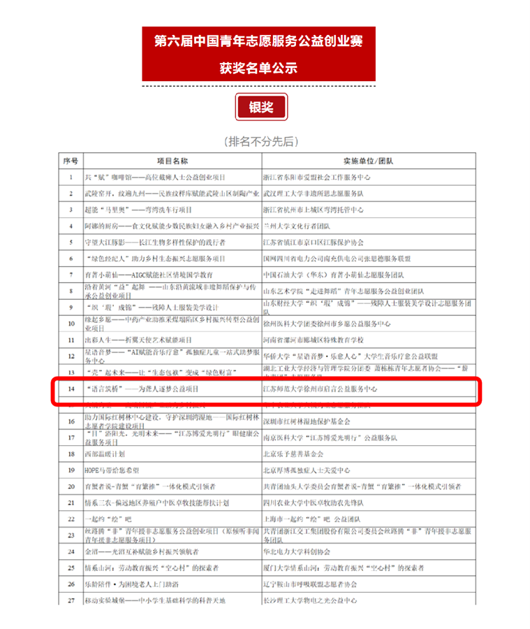 11月15日至16日,由共青團中央、中央社會工作部、民政部、水利部、文化和旅游部、國家衛生健康委、中國殘聯和中共廣東省委、廣東省人民政府聯合主辦的第六屆中國青年志愿服務公益創業賽國賽終評在汕頭舉辦。全國共有36個省級賽會單位累計1200余個公益創業項目參賽,271個項目進入國賽初評,100個項目入圍終評,最終產生10項金獎、40項銀獎和50項銅獎。江蘇省共有6個高校項目入圍全國終評,共獲4項銀獎和2項銅獎。我校語言科學與藝術學院劉俊飛、胡彥超、李倩南、劉承承老師指導的《“語言筑橋”——為聾人逐夢公益創業項目》榮獲銀獎。