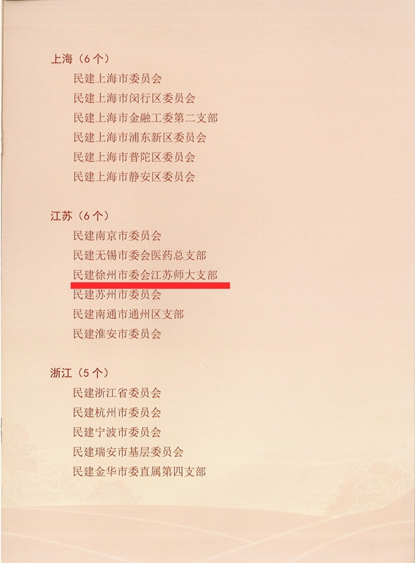 民建江蘇師大支部成立于2007年,共有會員26名,其中省人大代表1人、市政協(xié)常委1人、市政協(xié)委員1人、區(qū)政協(xié)委員2人。近年來,民建江蘇師大支部圍繞中心,服務(wù)大局,充分發(fā)揮特色優(yōu)勢,多篇調(diào)研課題及社情民意受到了民建中央、民建省委、中共江蘇省委、省政協(xié)、市政協(xié)等表彰,在參政議政、服務(wù)地方、科技創(chuàng)新和文化建設(shè)等方面集智聚力、開拓創(chuàng)新。疫情期間,民建江蘇師大支部關(guān)心關(guān)愛民族學(xué)生,開展“關(guān)愛疫情中的在校民族學(xué)生,助力學(xué)校民族學(xué)生管理”工作,搭建民建會員和民族學(xué)生溝通的橋梁,構(gòu)建“一對一”結(jié)對幫扶模式,逐步打造徐州民建“攜手育星”社會服務(wù)品牌。