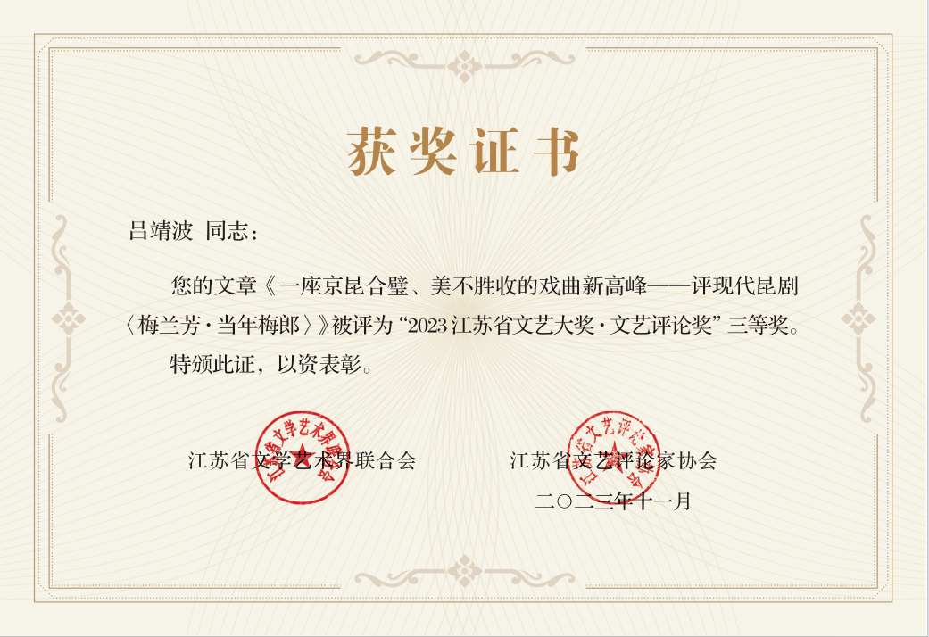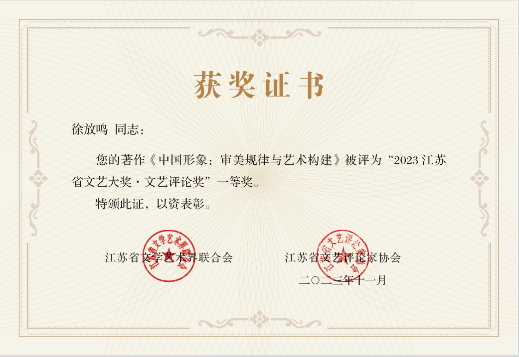 我校文學院徐放鳴教授申報作品《中國形象:審美規(guī)律與藝術(shù)構(gòu)建》(徐放鳴等著,高等教育出版社,2023年2月版),榮獲2023年江蘇省文藝大獎·文藝評論獎,位列一等獎第一名。學報編輯部主任呂靖波教授申報作品《一座京昆合璧、美不勝收的戲曲新高峰——評現(xiàn)代昆曲<梅蘭芳·當年梅郎>》(《藝術(shù)百家》,2021年第1期),榮獲2023年江蘇省文藝大獎·文藝評論獎三等獎。