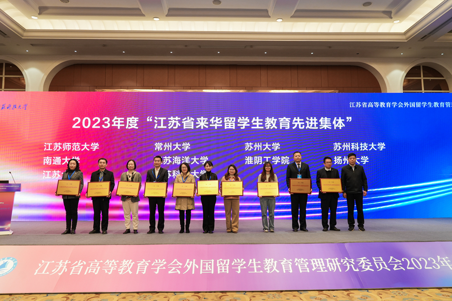 年會對2023年來華留學生管理工作進行了總結,對2024年工作進行了部署,相關單位進行了經驗分享。大會表彰了一批全省留管先進,我校被授予2023年度“江蘇省來華留學生教育先進集體”稱號,董海寧同志、樊雙元同志被評為“2023年度江蘇省留學生教育管理先進個人”,李京展同志被評為“2023年度江蘇省優秀留學生輔導員”。留學生輔導員李京展做大會交流發言《做“六有”留學生輔導員》,我校制作的留管工作紀實視頻《這一年》在大會開幕式上展映。