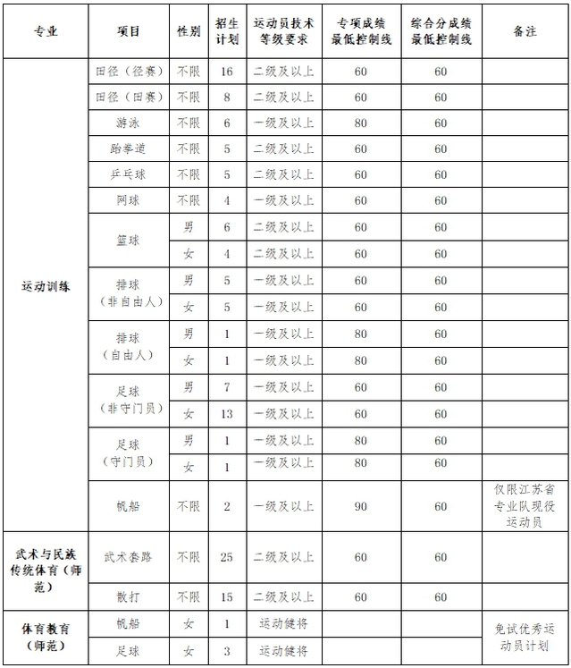1.運動訓練。面向全國計劃招生90人。招生項目:田徑、游泳、足球(十一人制)、籃球(五人制)、排球、乒乓球、跆拳道、網球、帆船。
