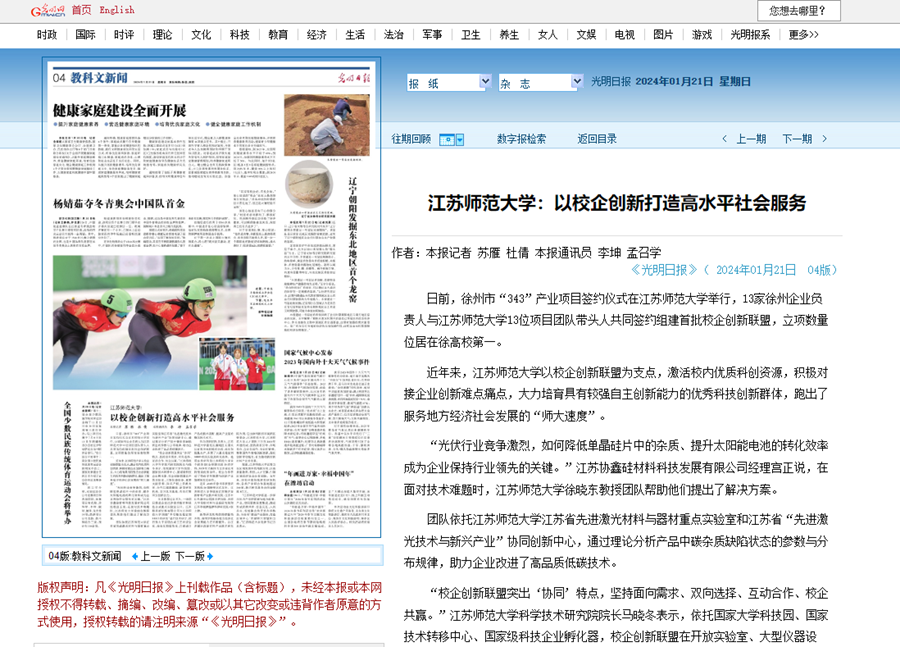 光明日報1月21日報道我校科研創新服務地方發展,報道內容如下: