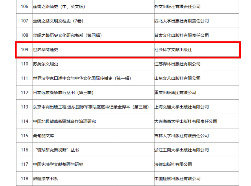 近日,國家出版基金規(guī)劃辦官網(wǎng)對2024年度國家出版基金資助項目予以公示。我校張秋生教授擔(dān)任首席專家的國家社科基金重大項目《世界華商通史》(五卷本)名列其中,計劃于社科文獻出版社出版。該著于2023年已獲批國家“十四五”社科重點出版項目。(一審:張秋生,二審:鄭曉坡,三審:殷子鈺)