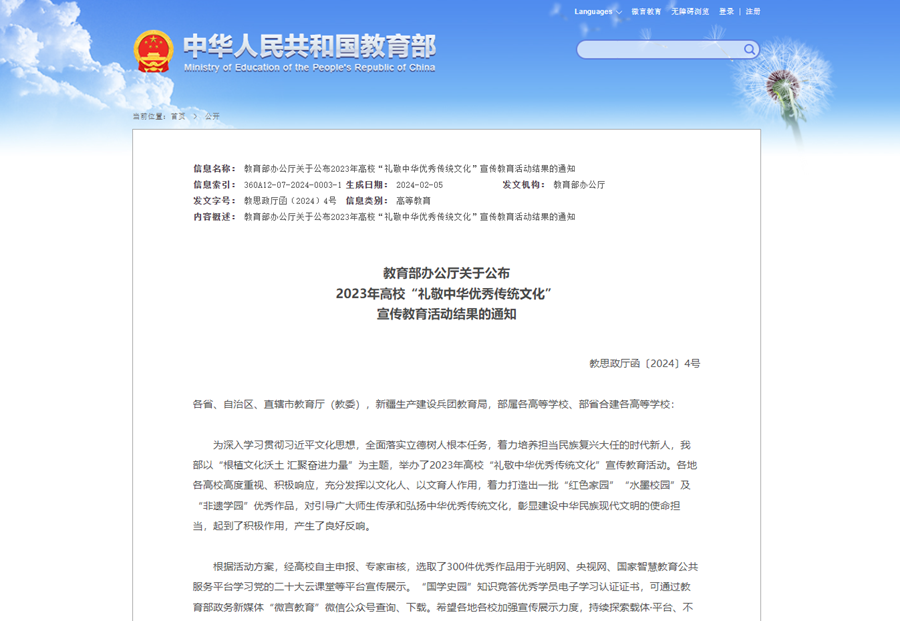 2023年高校“禮敬中華優秀傳統文化”宣傳教育活動由教育部思想政治工作司主辦,以“根植文化沃土匯聚奮進力量”為主題,分為“國學史園”知識競答、“紅色家園”視頻展覽、“水墨校園”繪畫聯播、“非遺學園”技藝比拼四項活動內容,旨在深入挖掘中華優秀傳統文化價值內涵,推動中華優秀傳統文化創造性轉化、創新性發展,以馬克思主義中國化時代化最新成果激發中華優秀傳統文化的生機與活力,用社會主義核心價值觀鑄魂育人,濃厚校園文化氛圍,增強校園文化活力,著力培養擔當民族復興大任的時代新人。