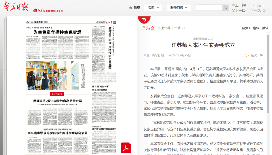 新華日報4月25日報道我校成立家長委員會,報道內(nèi)容如下: